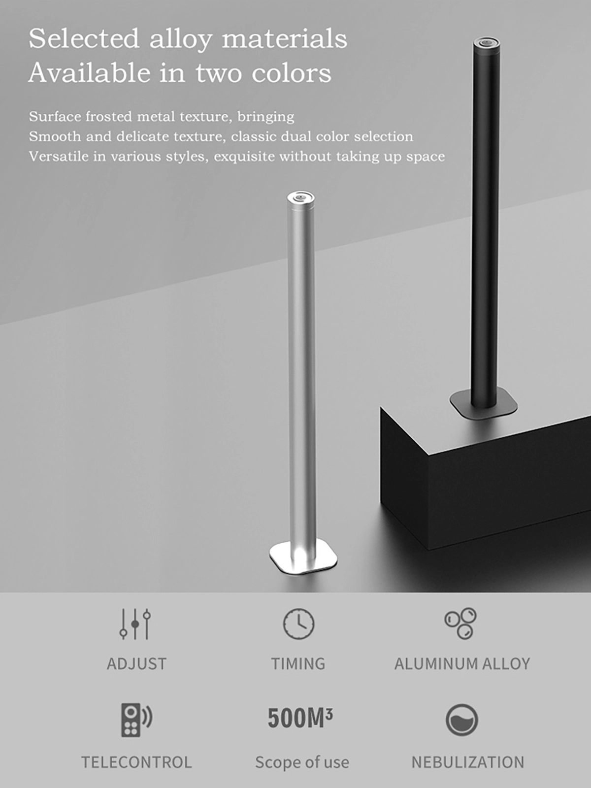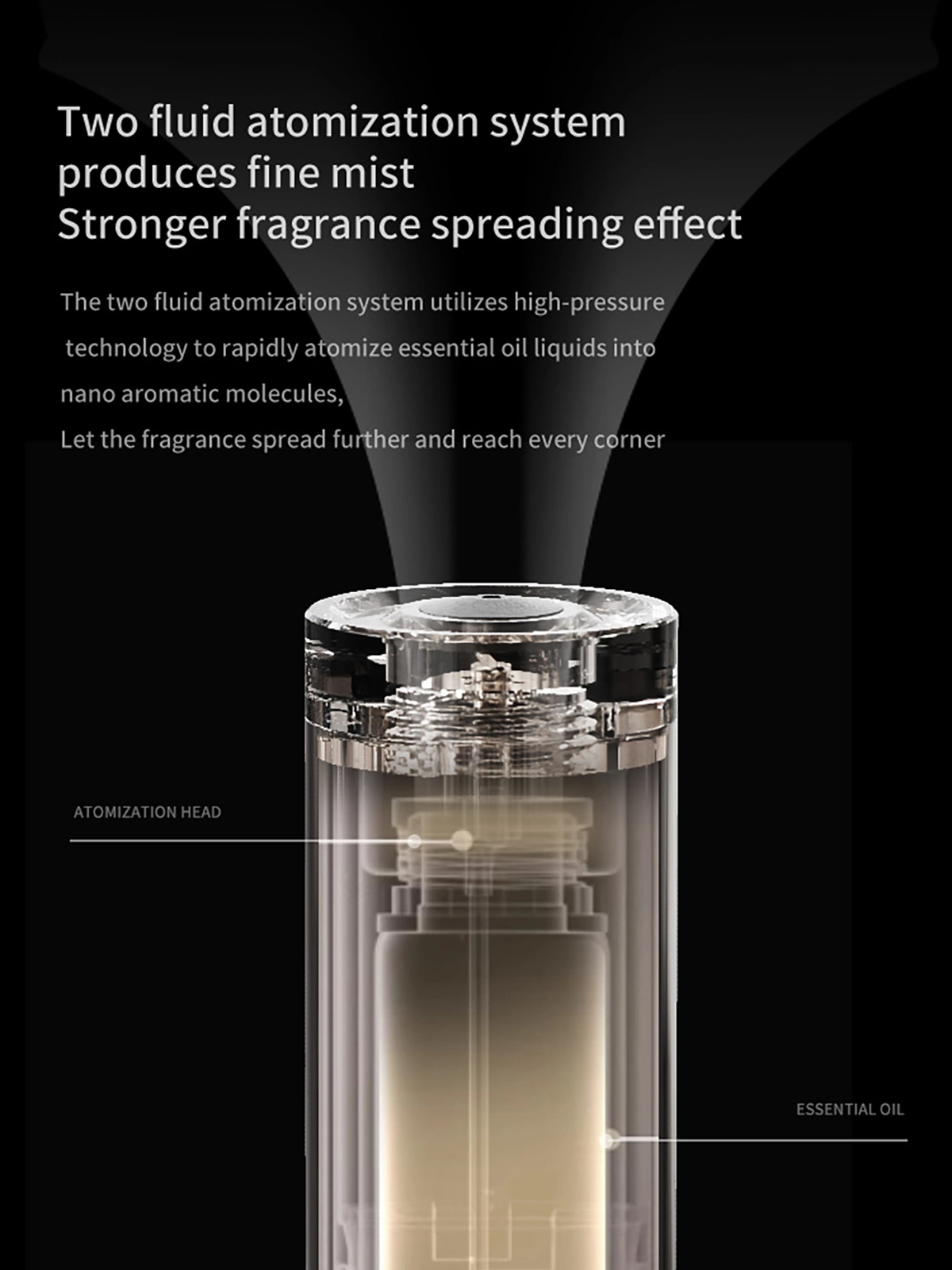 From a manufacturing perspective, the JY500 reflects precision engineering and durable construction. With a total weight of 2kg and a tall, modern form factor (φ65 × φ140 × H1000 mm), it blends seamlessly into professional interiors while maintaining excellent stability. Internal components are optimized for reliability, making this two-fluid aroma diffuser suitable for demanding commercial applications.